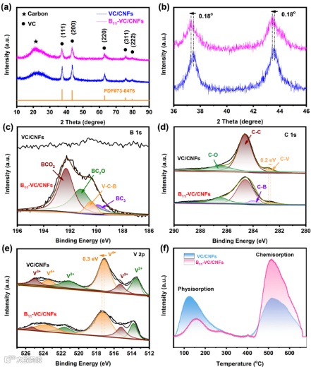 图3(a-b)VC/CNFs和B11-VC/CNFs的XRD谱图;(c-e)VC/CNFs和B11-VC/CNFs的B 1s、C 1s和V 2p XPS谱图;(f)N2-TPD曲线。
