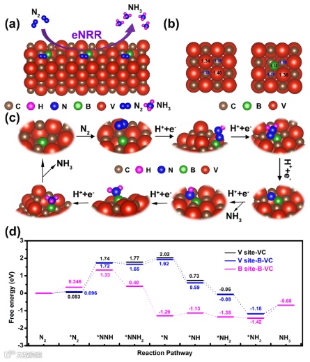 图1(a)B-VC模型表面的eNRR示意图;(b)VC和B-VC模型的电荷分布;(c)B-VC模型中通过B位点远端通路的eNRR反应路径;(d)VC模型的V位点、B-VC模型的V位点以及B位点的eNRR的反应路径图。
