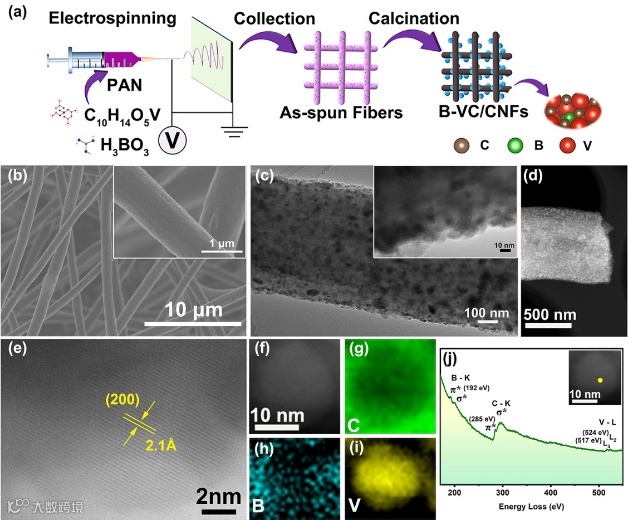 图2(a)B-VC/CNFs杂化材料合成工艺示意图;(b)B11-VC/CNFs的FE-SEM图;(c)TEM以及HR-TEM图;(d)高角环形暗场(HAADF)STEM图;(e)HR-TEM图;(f)高角环形暗场(HAADF)STEM图;(g-i)C、B和V的元素映射图;(j)B11-VC/CNFs的EELS图谱。