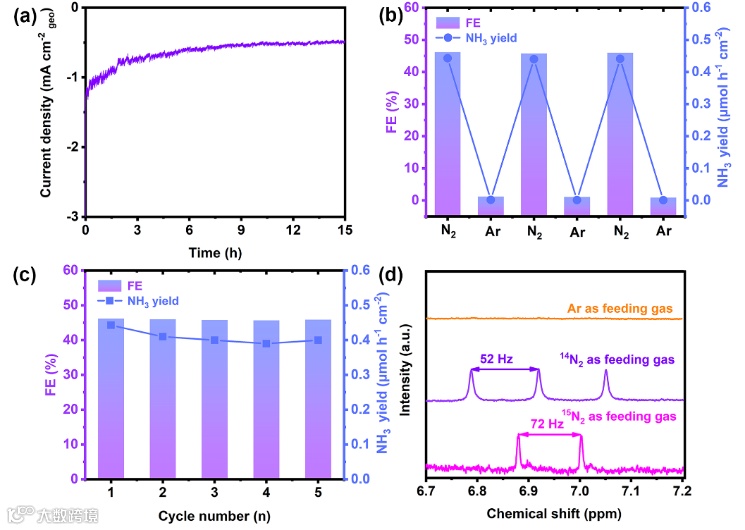 图5(a)B11-VC/CNFs在-0.6 V vs RHE的计时电流密度曲线;(b)在交替使用Ar和N2作为供给气下,B11-VC/CNFs的NH3产率和法拉第效率;(c)在-0.6 V vs RHE电位的循环稳定性结果(d)1H NMR图谱。