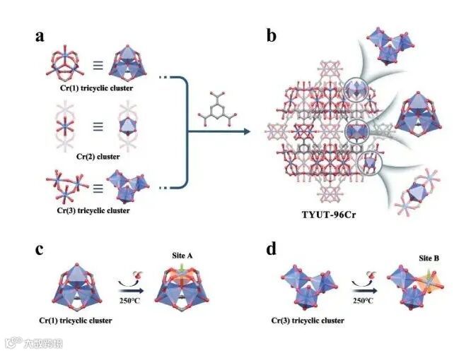 Figure 1. a, b) TYUT-96Cr结构中的三种Cr簇及链接方式;c, d) 两种Cr簇活化后形成的N2吸附活性位点。