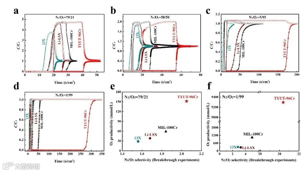 作者在研究过程中发现由于TYUT-96Cr中高密度Cr(Ⅲ)位点的存在,使得该材料在低压区展现出优异的N2捕获性能,穿透实验表明,随着混合气中N2含量的降低,该材料的优势逐渐体现,在1/99的N2/O2混合气组分下,TYUT-96Cr的能够高效捕获O2中的低浓度N2,分离性能及高纯O2产率远超商用的Li-LSX。