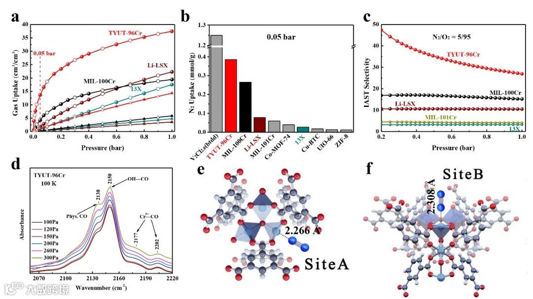 Figure 3. a, b, c) TYUT-96Cr 与目前已报道的N2/O2分离吸附剂的吸附等温线、低压吸附量及选择性对比。d) 利用原位CO吸附红外指认TYUT-96Cr中的Cr开放位点. e, f) DFT计算的N2分子在TYUT-96Cr中的吸附位点。