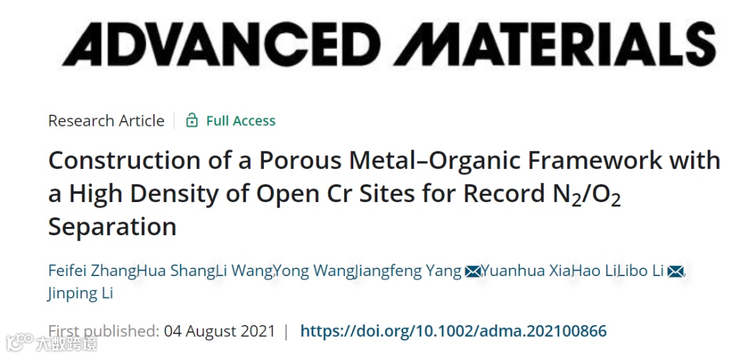 基于此,来自太原理工大学的李立博和杨江峰教授在国际知名期刊Advanced Materials上发表题为“Construction of a Porous Metal–Organic Framework with a High Density of Open Cr Sites for Record N2/O2 Separation”的研究性论文。