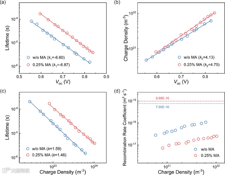 为了阐明这些过程,采用瞬态光电压(TPV)和瞬态光电流(TPC)研究了器件的电荷复合动力学。MA掺杂器件的载流子寿命在不同开压下有显著的提高,说明载流子湮灭被抑制,界面处的缺陷态密度降低。