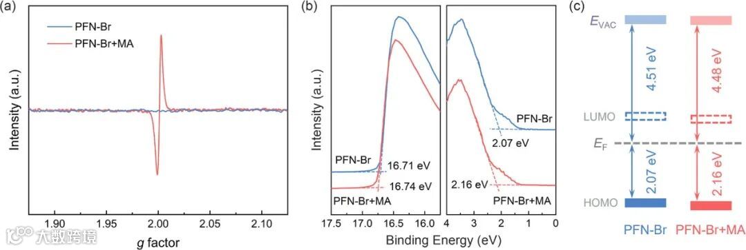 图2. PFN-Br掺杂前后的电子自旋共振谱(a)和紫外光电子能谱(b)。(c) PFN-Br掺杂前后的能级示意图。