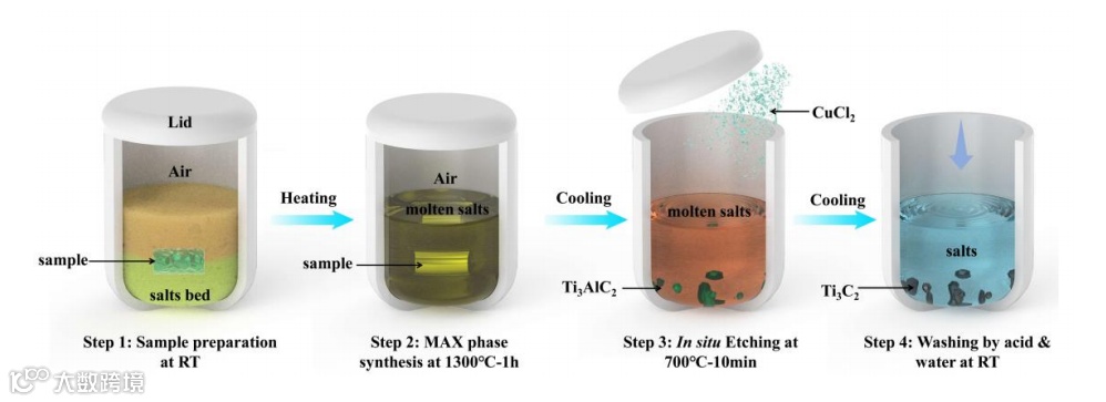 本研究将熔融盐法制备MAX与熔融盐路易斯酸刻蚀制备二维MXene思路相结合,以元素单质粉为原材料(step1),采用熔融盐在高温中原位制备MAX相(step2)后降温至700摄氏度加入路易斯酸盐原位刻蚀制备二维MXene材料(step3),刻蚀保温时长仅为10分钟便可达到较好刻蚀效果。