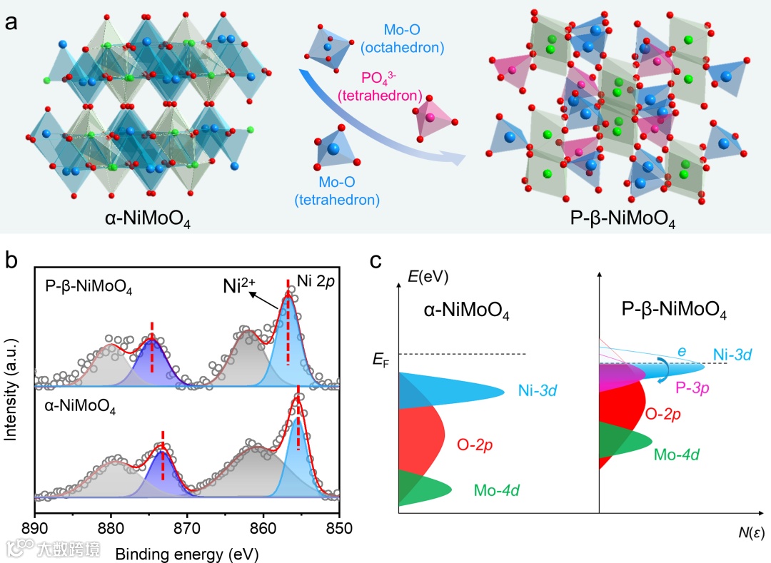该文章中,采用了独特非溶剂法来制备MOF中间体,该中间体在后续的磷化过程中起到了重要的作用。磷化过程中,部分磷酸根()取代钼酸镍(α-NiMoO4)中的钼酸根()是亚稳相钼酸镍(β-NiMoO4)可以在常温下稳定存在的关键,其中晶相转化示意图如图1a所示。