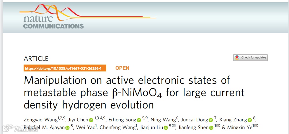 基于此,复旦大学叶明新/沈剑锋课题组和中科院上海硅酸盐研究所刘建军课题组共同设计,在国际知名期刊nature communications上发表题为“Manipulation on active electronic states of metastable phase β-NiMoO4 for large current density hydrogen evolution”文章。