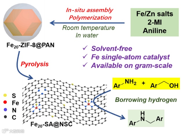 导读:该文章提供了一种通过ZIF热解制备Fe单原子催化剂的方法,此催化剂对芳香胺的N烷基化反应有优异的催化活性。