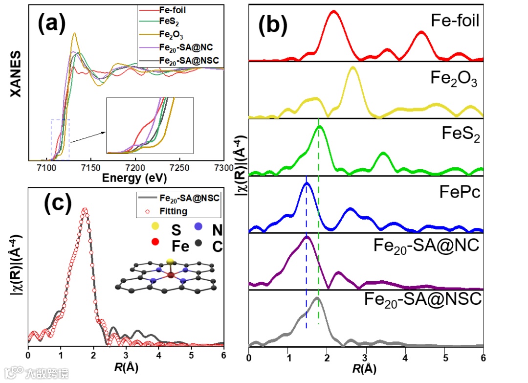 通过Mapping图像,可以发现N,S元素均匀分布在催化剂表面。通过XAFS表征发现,Fe于N,S发生了配位,拟合结果显示,单原子位点为Fe1-N4S1。