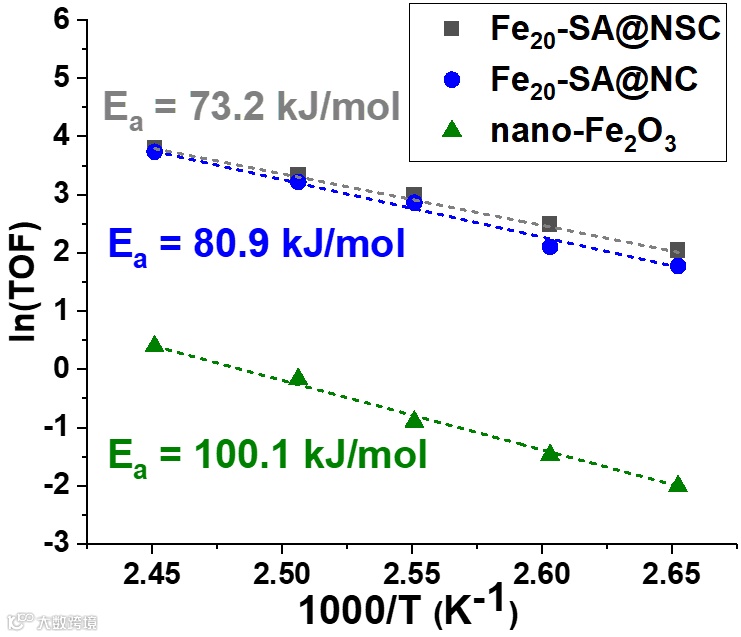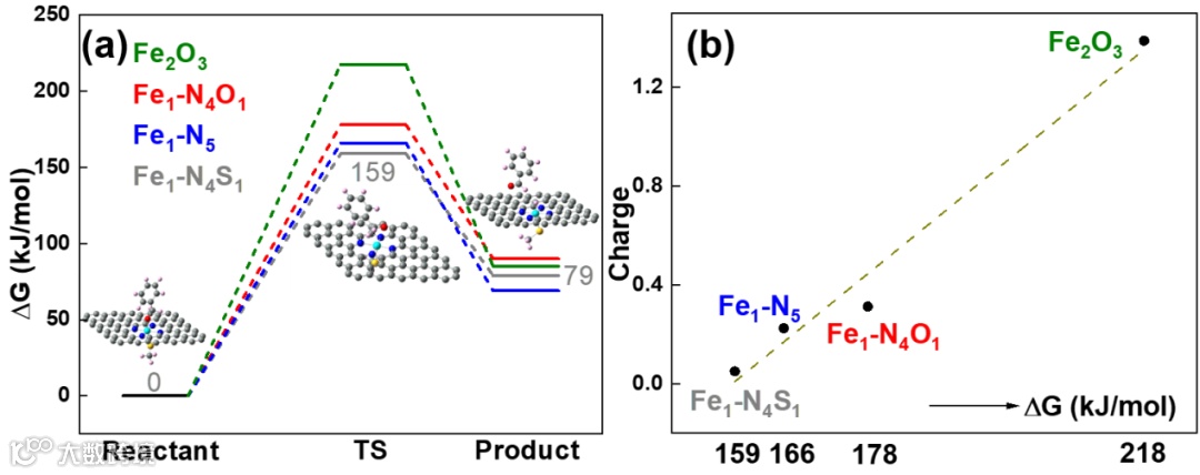 不同单 Fe 位点的能垒顺序为 Fe1-N4S1 < Fe1-N5 < Fe1-N4O1 < Fe2O3,与 Fe 位点的正电荷密度成正比。这些计算结果也与实验结果一致,其中Ea的顺序为Fe20-SA@NSC(Fe1-N4S1位点)< Fe20-SA@NSC(Fe1-N5或Fe1-N4O1位点) < 纳米 Fe2O3(Fe2O3位点)。