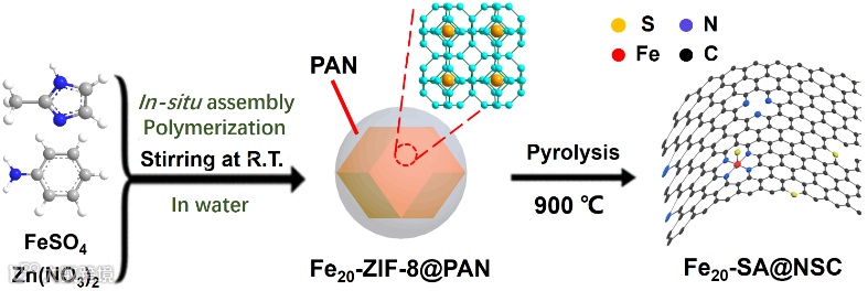 单原子催化剂具有100%原子利用率和非均相催化剂的特性。Fe基催化剂由于其优异的性能,在许多氧化还原反应中表现出良好的性能。因此,开发一种新型高效的Fe单原子催化剂是非常有吸引力的。沸石咪唑骨架(ZIF)由于其合成方法简单、氮含量高、孔径均匀,可作为多孔氮掺杂碳材料的理想牺牲模板。然而,由于受Ostwald效应的影响,ZIF 的直接热解通常会导致 Fe的聚集,从而降低其催化活性。