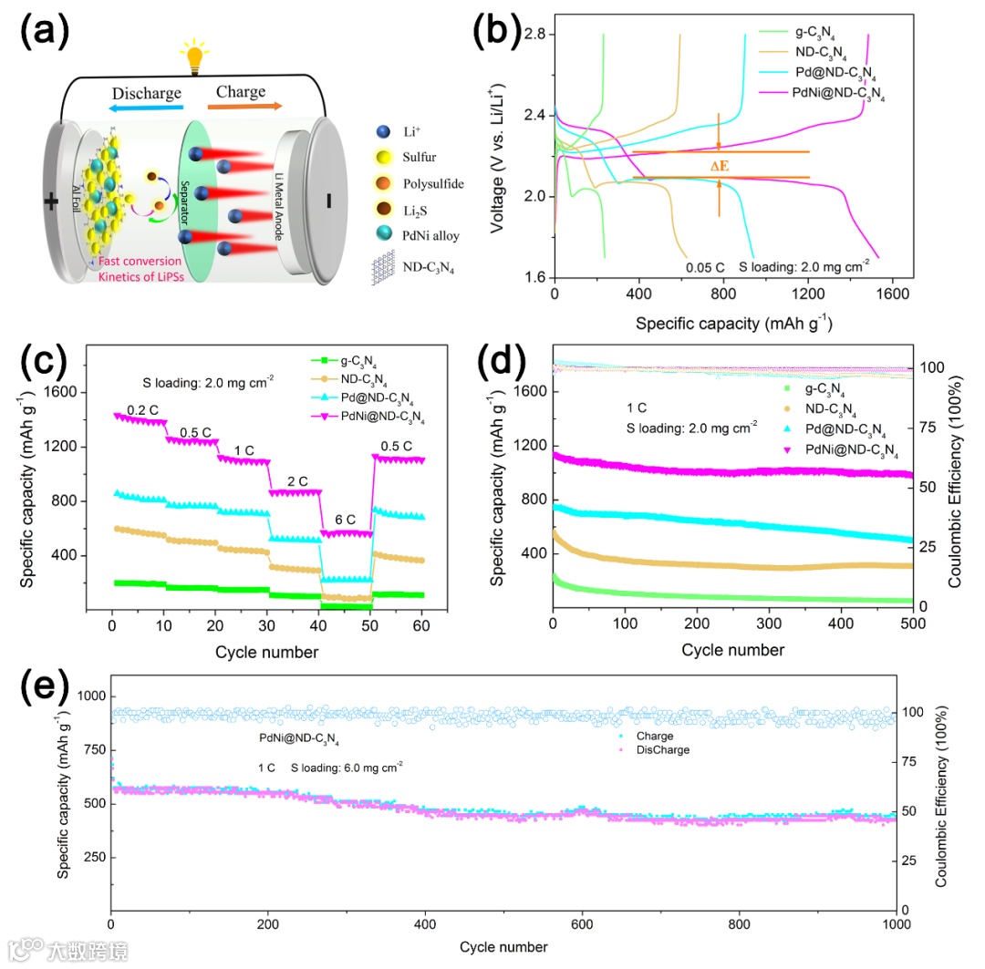 导读:本文首次将高导电性的贫氮C3N4与微量中空PdNi复合,结合LiPSs多步吸附活性位点、NV-Sx-(Pd-Ni)双亲界面和增强Li离子传输性能的优势