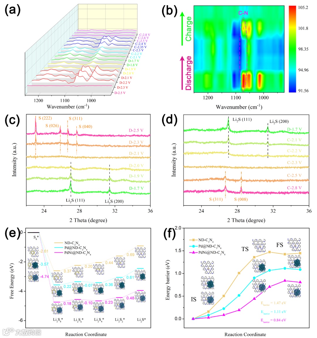 Figure 4. Study on the conversion process of LiPSs. a) In-situ FT-IR spectra of PdNi@ND-C3N4 cathode at different discharge and charge states. b) Contour and response surface analysis corresponding to the discharge and charge processes. Ex-situ XRD patterns of PdNi@ND-C3N4 cathode at different c) discharge and d) charge states. e) Energy profiles for the reduction of LiPSs and f) decomposition of Li2S on ND-C3N4, Pd@ND-C3N4, and PdNi@ND-C3N4 substrates, respectively (The black, blue, yellow, pink, dark green, and light blue balls represent C, N, S, Li, Pd, and Ni atoms, respectively).