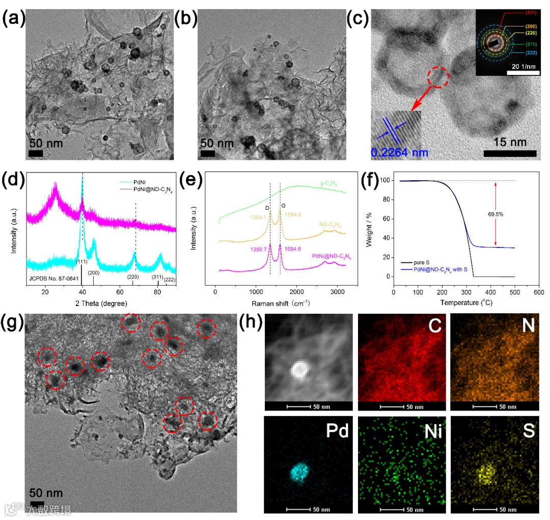 Figure 2. The characterization analysis of PdNi@ND-C3N4 composite. a,b) TEM images of PdNi@ND-C3N4 hybrids. c) HRTEM image of hollow PdNi nanospheres, and the SAED pattern in the upper right corner. d) XRD patterns of pure PdNi and PdNi@ND-C3N4. e) Raman patterns of g-C3N4, ND-C3N4, and PdNi@ND-C3N4. f) TGA curves of pure S and PdNi@ND-C3N4 with S. g,h) HAADF-STEM and elemental mappings of PdNi@ND-C3N4 with S.