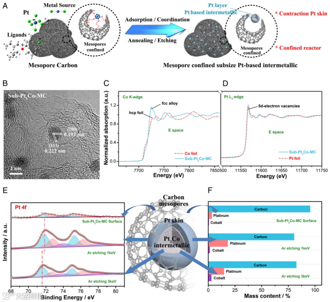 图1. 介孔限制的Pt-M金属间化合物-Pt表层结构