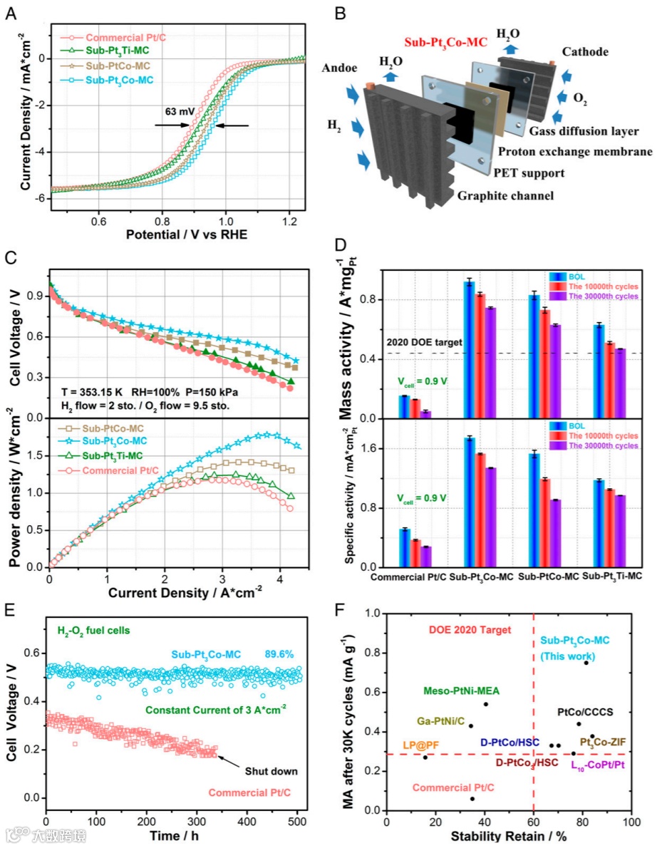 (A)亚-Pt金属间化合物-MC和商用Pt/C的CV(1600转/分),(B)亚Pt3Co - MC基燃料电池结构示意图,(C)亚Pt3Co - MC和商用Pt/C的H2-O2燃料电池极化曲线,(D)开始时、10000次循环后和30000次循环后的Pt3Co-MC和商业Pt/C的质量活性,(E)在恒流(3 A cm−2)下对Pt3Co - MC的H2-O2燃料电池的测量,(F)燃料电池中质量活性和稳定性保持的比较。