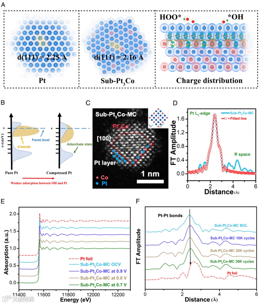 (A) Pt3Co金属间化合物和纯Pt表面Pt(111)距离和电荷密度分布的DFT计算,(B)Pt3Co - MC的d带理论分析,(C)制备的Pt3Co - MC的HAADF图像,(D)Pt3Co - MC的XAFS测量,(E)不同电位下Pt3Co - MC的Pt-L3边的原位EXAFS,(F)在不进行相位校正的情况下,Pt3Co - MC的Pt L3-edge原位XANES。