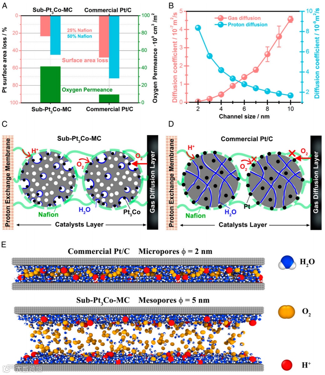 (A) CO溶出的表面损失和氧渗透性测量,(B)质子和气体的扩散能力随孔径的变化,(C)Pt3Co - MC中三相界面的解毒作用,(D) Nafion对商用Pt/C的毒性作用,(E)Pt3Co - MC三相界面的仿真。