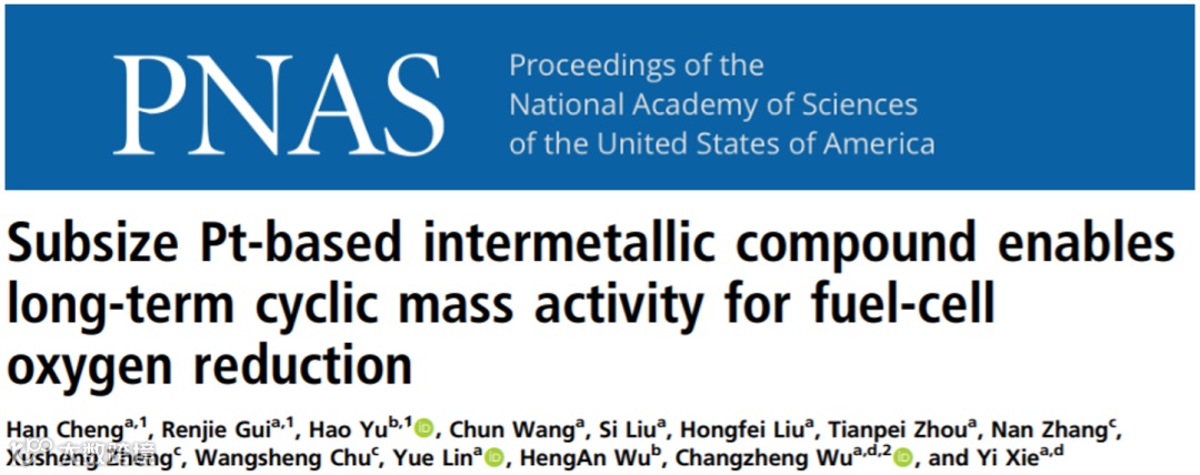 中国科学技术大学谢毅院士和吴长征教授在美国科学院院刊PNAS上发文,Subsize Pt-based intermetallic compound enables long-term cyclic mass activity for fuel-cell oxygen reduction,针对Pt基合金催化剂的循环寿命短的问题,进行了新材料结构的探索。
