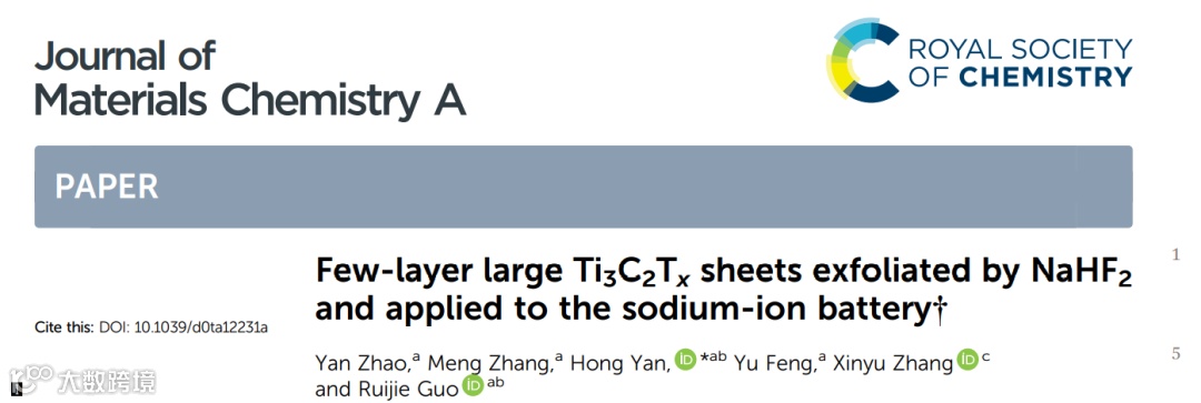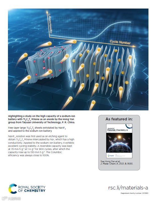 近日,来自太原理工大学的晏泓教授,在国际知名期刊Journal of Materials Chemistry A上发表题为“Few-layer large Ti3C2Tx sheets exfoliated by NaHF2 and applied to the sodium-ion battery”的封底文章。