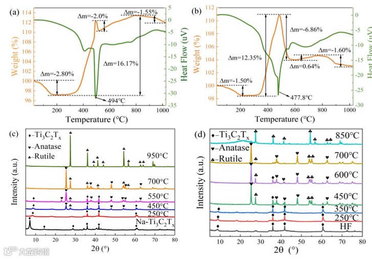 图3. Na-Ti3C2Tx (a) 和HF-Ti3C2Tx (b)在空气中从室温升到1000 °C的TG-DTA曲线;Na-Ti3C2Tx (c) 和HF-Ti3C2Tx (d) 在空气中不同温度下热处理2 h后的 XRD谱图