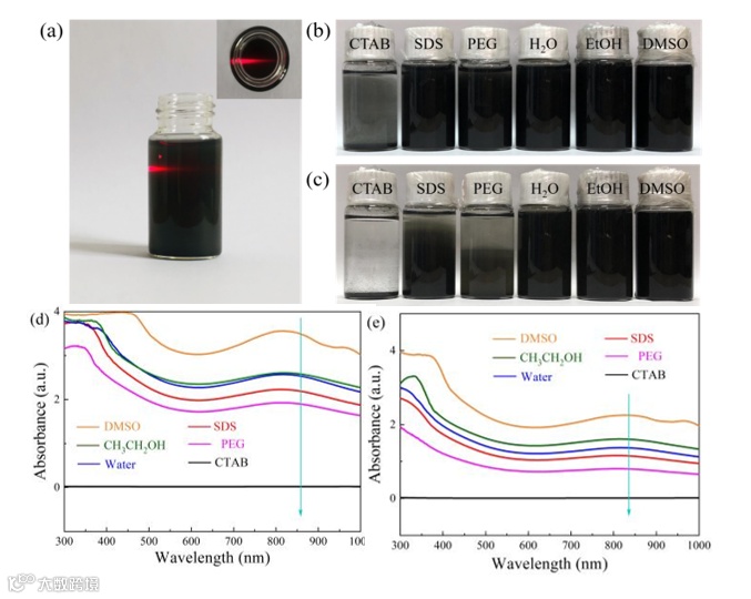 图2. Na-Ti3C2Tx在水溶液中的丁达尔效应照片(a);Na-Ti3C2Tx在六种溶剂中分散12 h (b) 和96 h (c)后的照片;Na-Ti3C2Tx在六种溶剂(溶液稀释10倍)中的UV-Vis吸收光谱:12 h (d) 和96 h (e)。