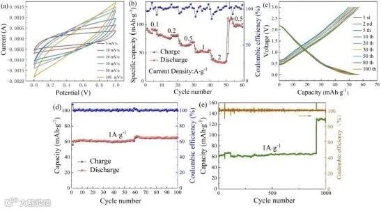 图4. Na-Ti3C2Tx在5~100 mV·s-1不同扫描速率下的初始循环伏安曲线 (a);倍率性能 (b);1 A·g−1下充放电曲线 (c);1 A·g-1下循环100次后的循环稳定性和库伦效率 (d);1 A·g−1下的循环稳定性和库伦效率 (e)