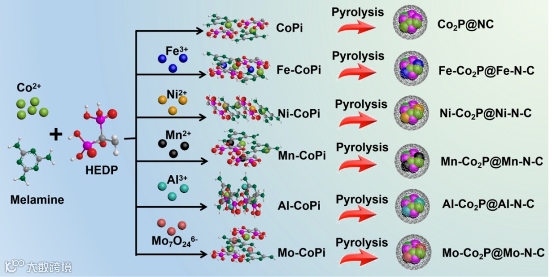 导读:该工作利用有机膦酸盐-三聚氰胺聚合碳化策略,于Co2P@NC电催化剂的核内和壳上掺杂第二类过渡金属元素(如Fe, Ni, Mn等)