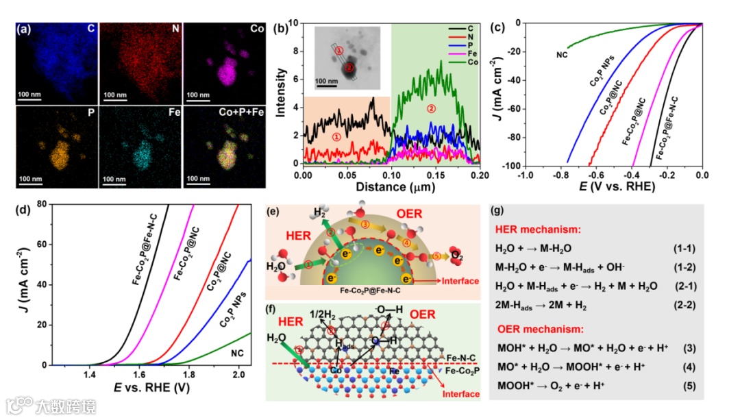 图2. 对比样品Fe-Co2P@NC电催化剂的合成(a, b)及不同样品的电化学活性对比(c, d)。Fe-Co2P@Fe-N-C电催化HER和OER过程所遵循的机理预测(e-g)。