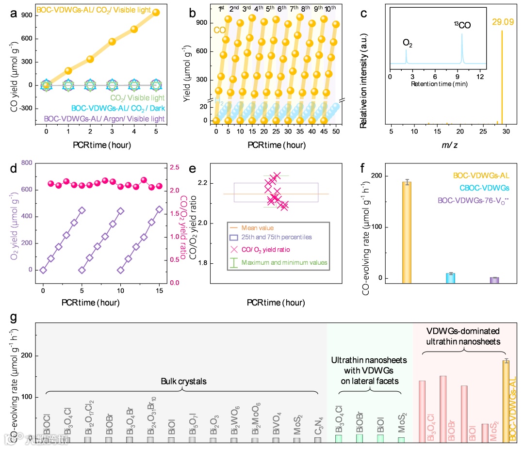 图3. 富范德华带隙BOCVDWGsAL纳米片在纯水中光催化还原CO2性能表征。