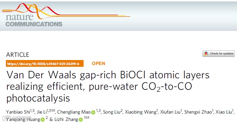 张礼知教授团队NC研究论文:富范德华带隙氯氧化铋原子层在纯水中光催化CO2转化