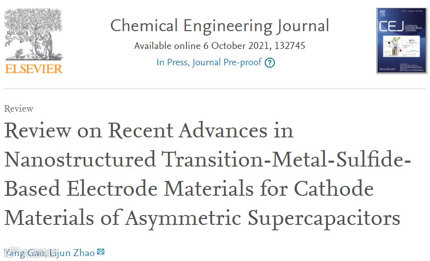 基于此,来自吉林大学的赵丽君教授,在国际知名期刊Chemical Engineering Journal上发表题为“Review on Recent Advances in Nanostructured Transition-Metal-Sulfide-Based Electrode Materials for Cathode Materials of Asymmetric Supercapacitors”的综述文章。