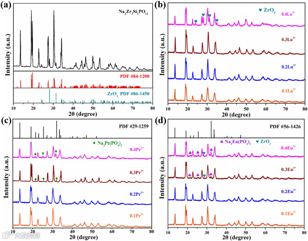 使用高温固相法制备了Na3+xZr2-xPrxSi2PO12、Na3+xZr2-xEuxSi2PO12和Na3+xZr2-xLuxSi2PO12 (x=0∼0.4 )固体电解质。由于Pr3+ (99 pm) 和Eu3+ (94.7 pm)的离子半径远大于Zr4+ (72 pm),多余的掺杂离子无法完全嵌入NASICON的晶格中,从而形成了新相Na3Pr(PO4)2和 Na3Eu(PO4)2。