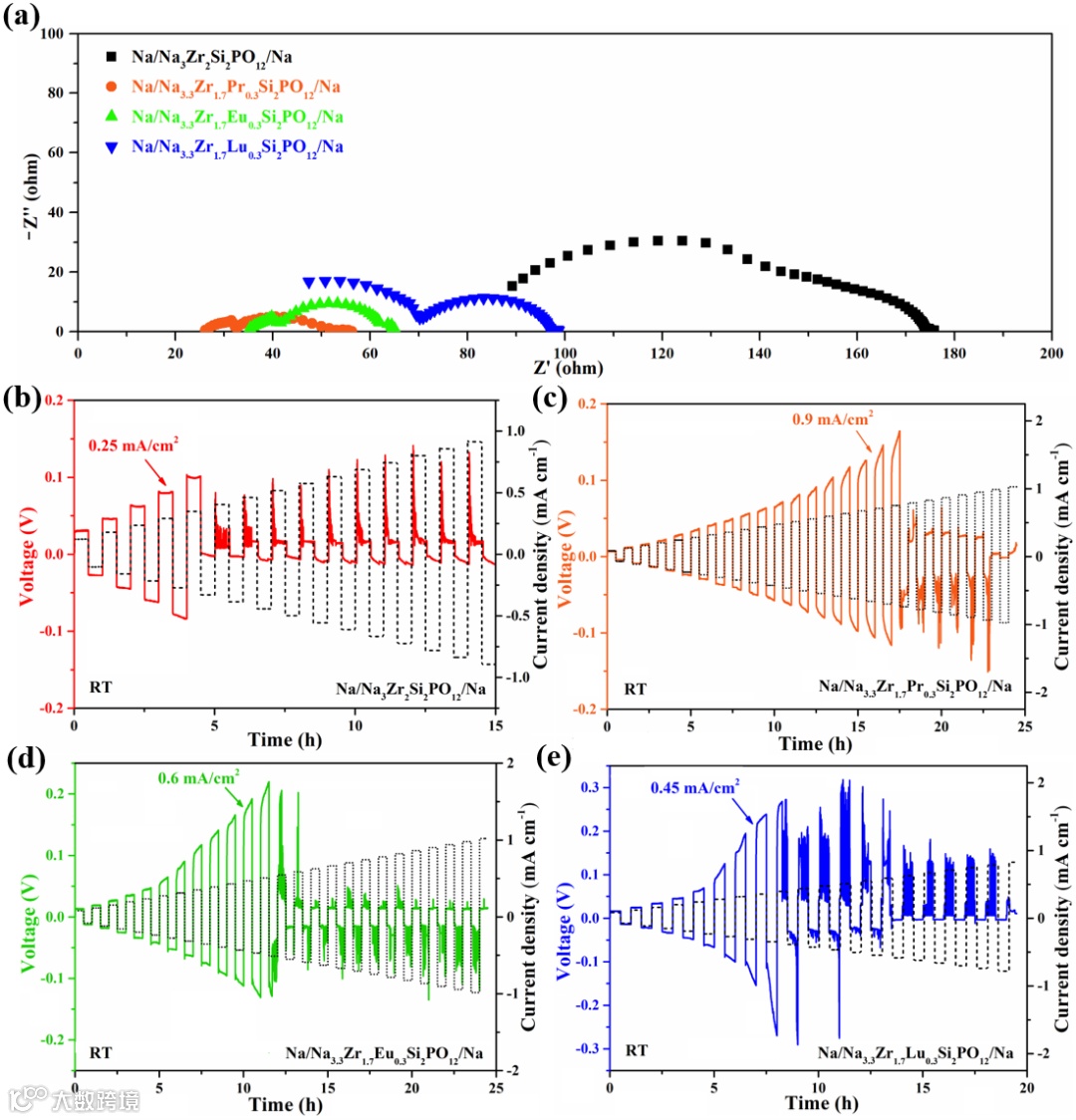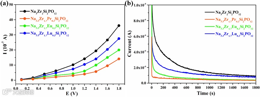 导读:该文章制备了低电负性镧系离子(Pr3+、Eu3+、Lu3+)掺杂的NASICON 型固体电解质, 提高了离子电导率和相对密度,降低了电子电导率,从而提升了电解质耐受钠枝晶生长的能力。