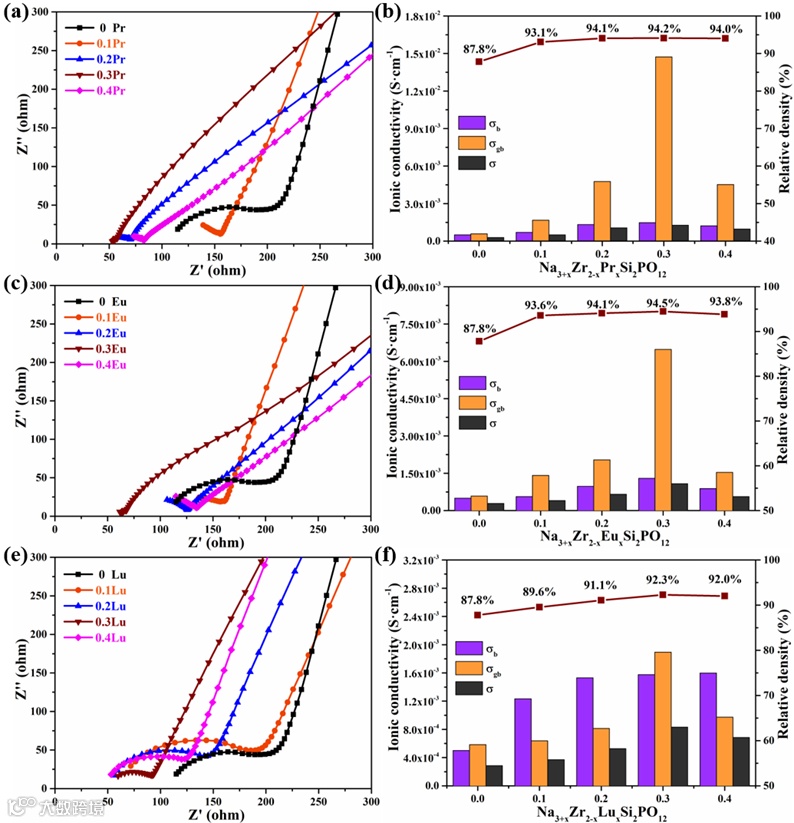 5)离子掺杂NASICON相对密度的提升减少了陶瓷中的空隙,致密的微观结构可以促Na+在晶界处的运动,从而提高晶界离子电导率和总离子电导率。