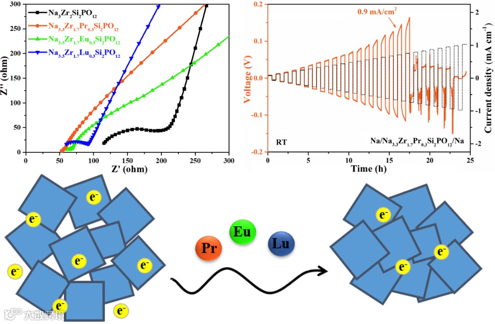图1.镧系离子掺杂提升NASICON固体电解质的离子电导率和相对密度、降低电子电导率从而提升临界电流密度的示意图。