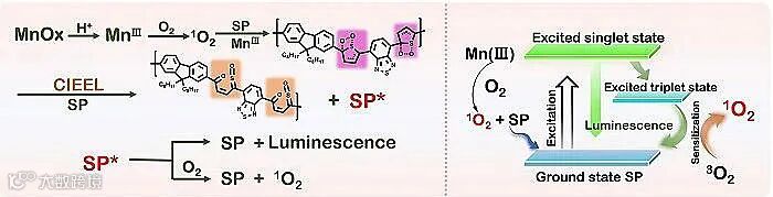 该研究提出了基于锰-噻吩的化学发光体系的反应机理(图4),锰氧化物在酸性条件下释放单线态氧(1O2);1O2可以通过π2-π2环加成将聚合物单元中的噻吩氧化,从而形成噻吩-二氧杂环中间体,该中间体能自然降解并产生化学能;所产生的化学能通过CIEEL过程转移到未氧化的半导体聚合物中,形成激发态的半导体聚合物。被激发的半导体聚合物能够同时产生CL和大量的1O2。