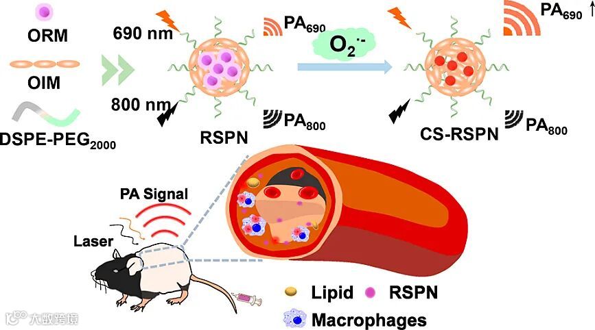 该实验室通过将超氧阴离子响应的ORM和不敏感的OIM同时封装到两亲性聚合物DSPE-PEG中,开发了一种可激活的比率半导体纳米颗粒(RSPN),用于动脉粥样硬化合并肺炎斑块超氧阴离子(O2•-)的比率光声成像,从而评估易损性斑块的风险性。