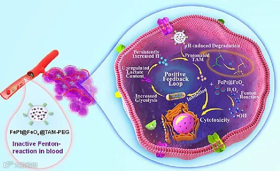 该研究提出了高效且高特异性CDT的机制(图7),在肿瘤的微酸性条件下,由于TAM的pH响应,发生从疏水性到亲水性的TAM转变,FePt@FeOx@TAM-PEG被分解,释放出FePt@FeOx催化肿瘤内源性H2O2反应生成•OH;重要的是,释放的TAM作为线粒体复合物I的抑制剂能够增强糖酵解和乳酸含量,从而导致癌细胞内H+积累,从而克服了肿瘤微酸性的局限性;癌细胞酸化程度的升高可进一步促进FePt@FeOx@TAM-PEG的分解形成正反馈回路释放了更多FePt@FeOx纳米催化剂和TAM药物,并增强了它们在肿瘤中的催化活性,从而产生更高毒性的•OH诱导细胞凋亡。