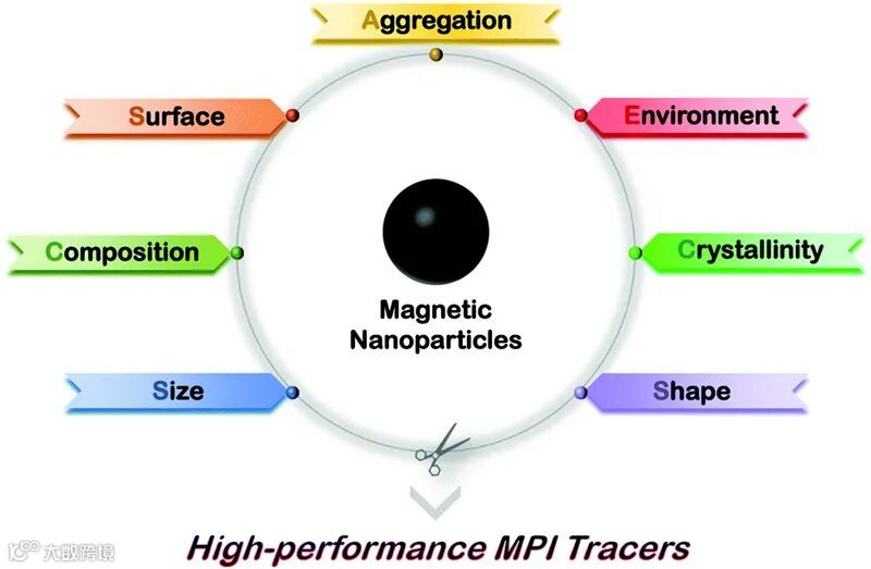 磁性示踪剂的设计与合成是磁性粒子成像研究的重点,磁性粒子成像的分辨率与灵敏度和磁性纳米颗粒的性质密切相关。宋国胜教授与斯坦福大学Rao Jianghong教授合作,系统总结了用于MPI成像的磁性粒子合成以及在MPI成像中的应用。总结了示踪剂性能的影响参数,包括尺寸、形状、成分、表面性质、结晶度、应用环境和聚集状态等,为设计更好性能的MPI示踪剂提供指导(图13)。讨论了MPI成像技术在临床转化中的应用及其面临的挑战和前景(Chem. Soc. Rev., 2021, DOI: 10.1039/D0CS00260G)。