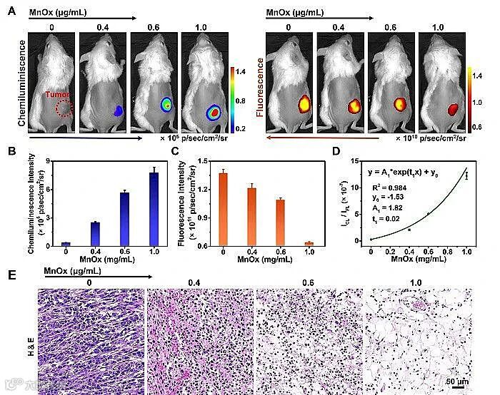此外,由锰氧化物与半导体聚合物构成的纳米体系在酸激活下产生CL的同时也伴随着FL强度的降低。该体系能够在体外建立良好的比率型信号(CL/FL)与ROS产率之间的相关性(R2=0.992),并进一步建立活体CL/FL信号与CDT治疗后肿瘤抑制率之间的良好相关性(图5)。相关研究成果的研究论文发表在化学领域顶级期刊Chem(Chem, 2020, 6, 2314-2334)。