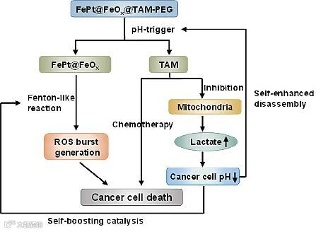 该实验室通过将核-壳结构FePt@FeOx纳米颗粒和pH响应的他莫昔芬(TAM)药物同时封装到聚合物聚苯乙烯-顺丁烯二酸酐(PSMA)中,并用聚乙二醇-氨基(PEG-NH2)对其进行改性,提出了一种新颖的策略来调节纳米催化剂用于癌症治疗的催化活性(图6)(Angew. Chem. Int. Ed., 2021, 60, 9562-9572)。