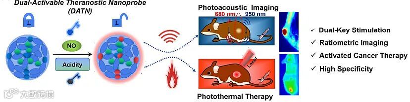 基于肿瘤微环境中较高水平的NO和低pH值的特性,团队设计合成了NO/酸共激活的(D-π-A-π-D)型响应分子,同时合成了另一种惰性分子作为内参,通过组装形成“双钥匙-单锁”智能纳米探针(图10)。只有在NO和酸的共激活下,纳米探针的光声、光热性能开启,通过输出比例光声、光热信号,用于高特异性的肿瘤成像和肿瘤光热治疗(J. Am. Chem. Soc., 2019, 141, 13572-13581)。