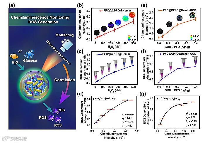 图2. (a)化学发光监测ROS生成机制示意图。(b-g) 化学发光强度与ROS产量的相关性。