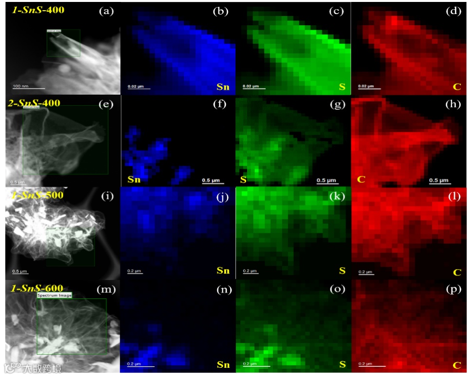 如图1所示,通过对比相同含碳量,不同温度下样品的元素分布图 (1-SnS-400, 1-SnS-500和1-SnS-600), 可以发现随着温度的升高,SnS的收缩现象越明显。Sn元素的分布向内部迁移明显,从而产生了S 缺陷,说明制备温度的升高有利于缺陷的产生。