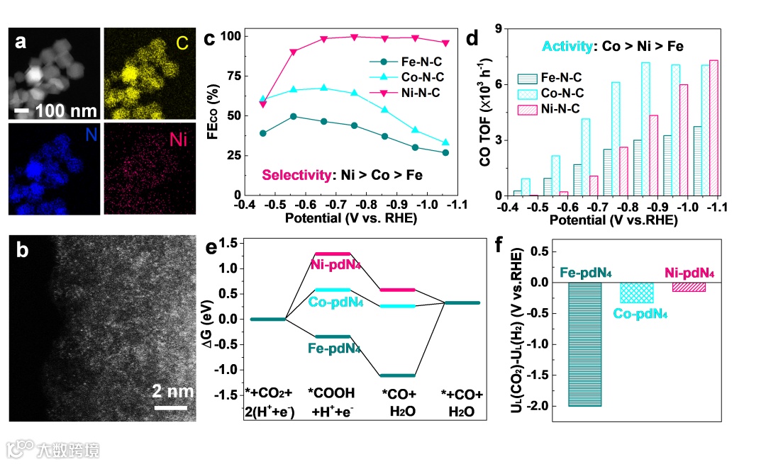 图2. (a-b) Ni-N-C的TEM图和HAADF-STEM图。(c–d) M-N-C的性能测试图。(e-f) DFT理论计算图。