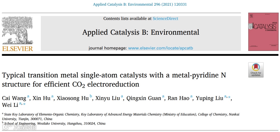 南开大学李伟教授课题组ACB:Environ研究文章:具有金属-吡啶N结构的过渡金属单原子催化剂高效电还原二氧化碳 科学材料站