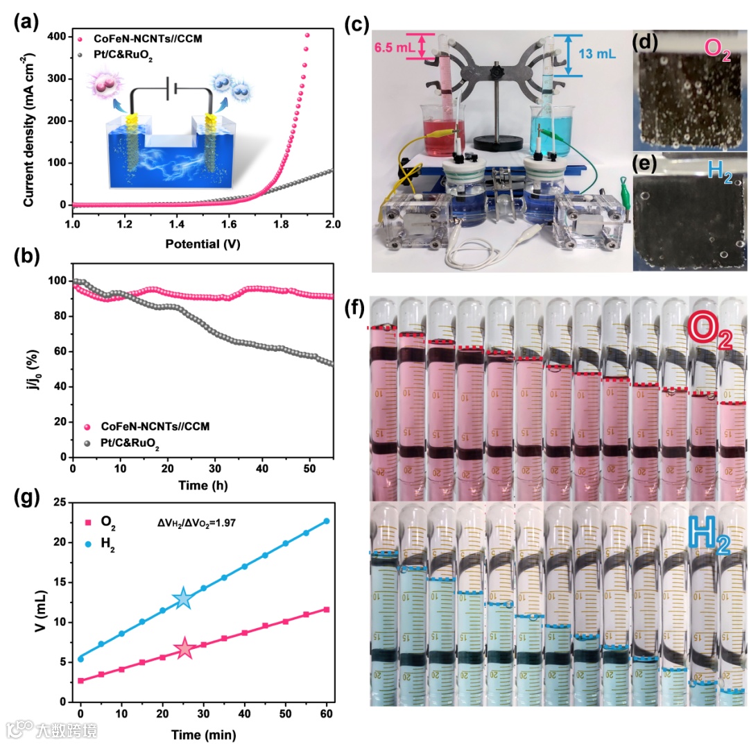 图 5. 基于CoFeN-NCNTs//CCM和Pt/C&RuO2的水分解系统的 a) LSV曲线和b) 稳定性测试。c)由锌-空气电池供电的水分解系统。d) OER电极和 e) HER 电极上生成气体的照片。f) 以5分钟为间隔生成O2和H2量的照片。g) O2和H2生成量随时间的变化曲线。